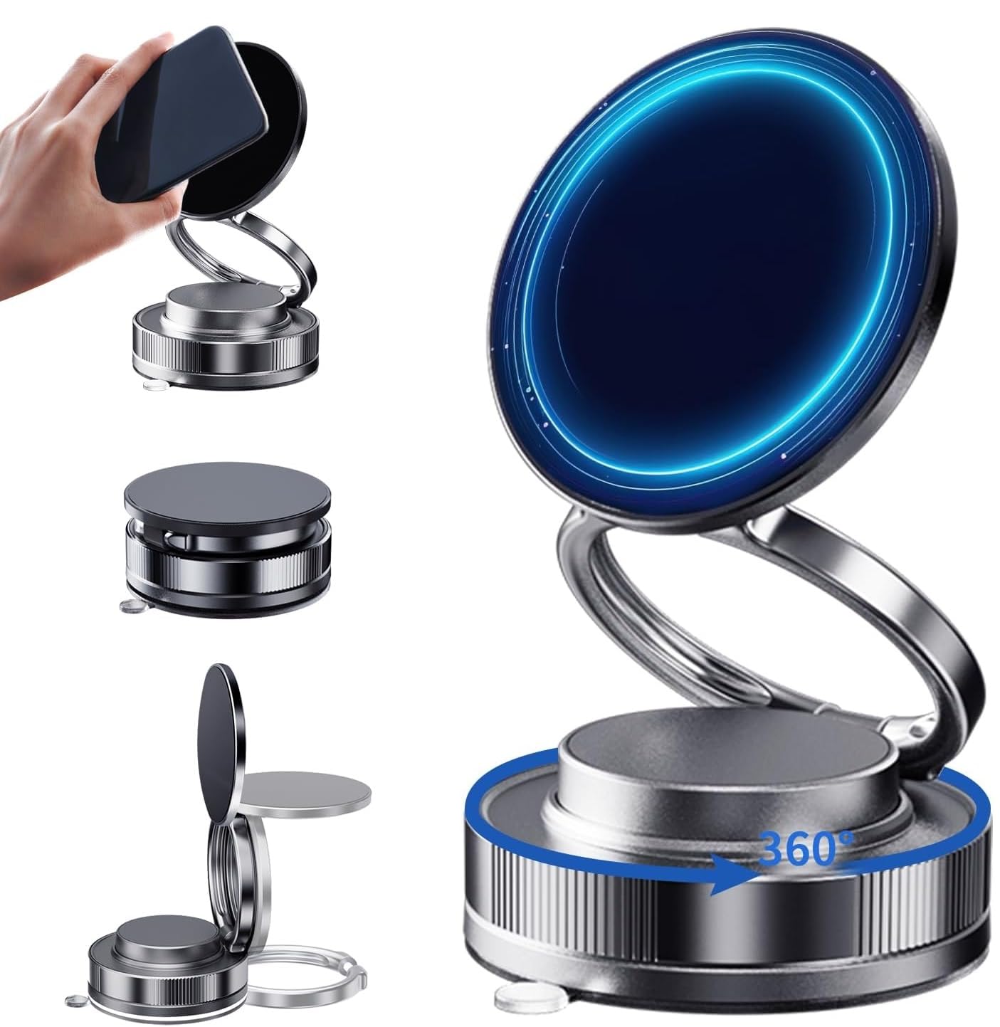 - Easy Installation: Features a strong Vacuum suction base for mounting on dashboards, windshields, or flat surfaces without leaving any residue.
