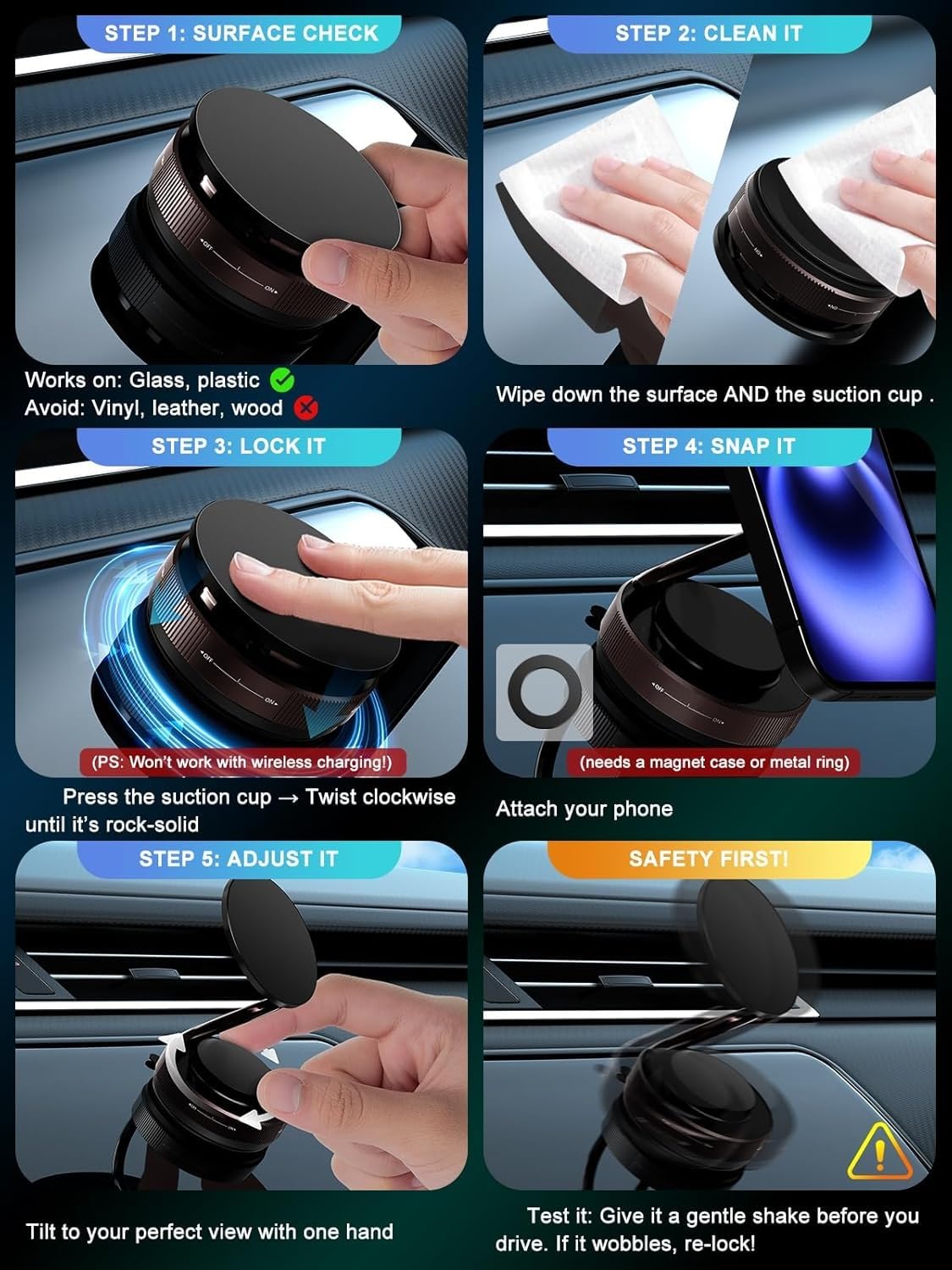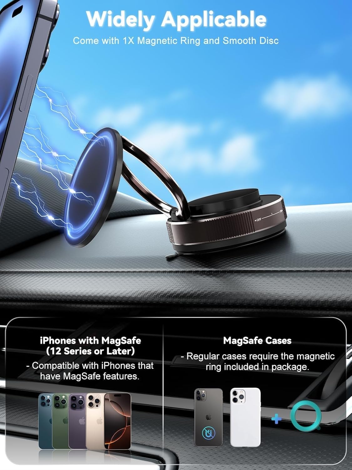 - Universal Compatibility with Magnetic Ring: Works with all smartphones, including non-magnetic devices, thanks to the included magnetic ring that ensures a secure grip for mobile stand for car dashboard